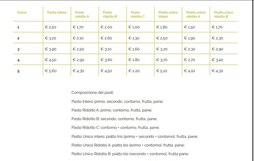 a cui corrispondono diverse tariffe in base al tipo di pasto: