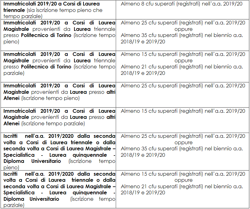 L’unico requisito, quindi, è l’aver ottenuto un numero minimo di CFU (diverso in base alle varie situazioni) tra il 10 agosto 2019 e il 10 agosto 2020: